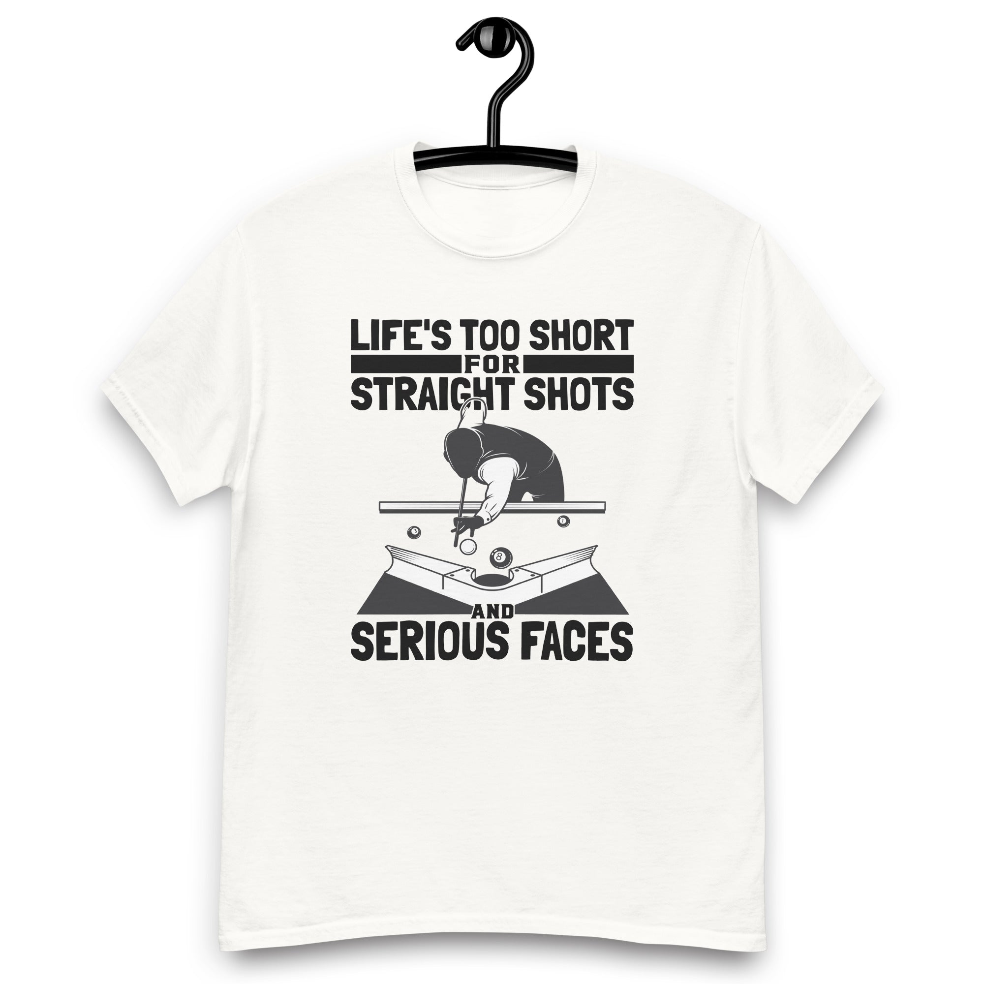 🎱 Striking Design: A cool graphic of a billiards pro lining up a shot, with the witty slogan “Life’s Too Short for Straight Shots and Serious Faces” emblazoned above. Because who wants to be serious when you can be a pool shark with a sense of humor?